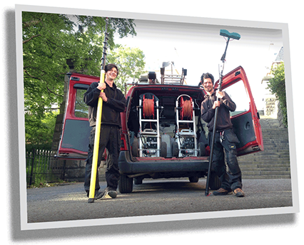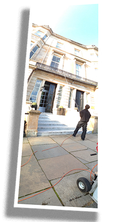 Purified (de-ionised) water is pumped up an extendible pole to a brush, which scrubs and rinses the glass.